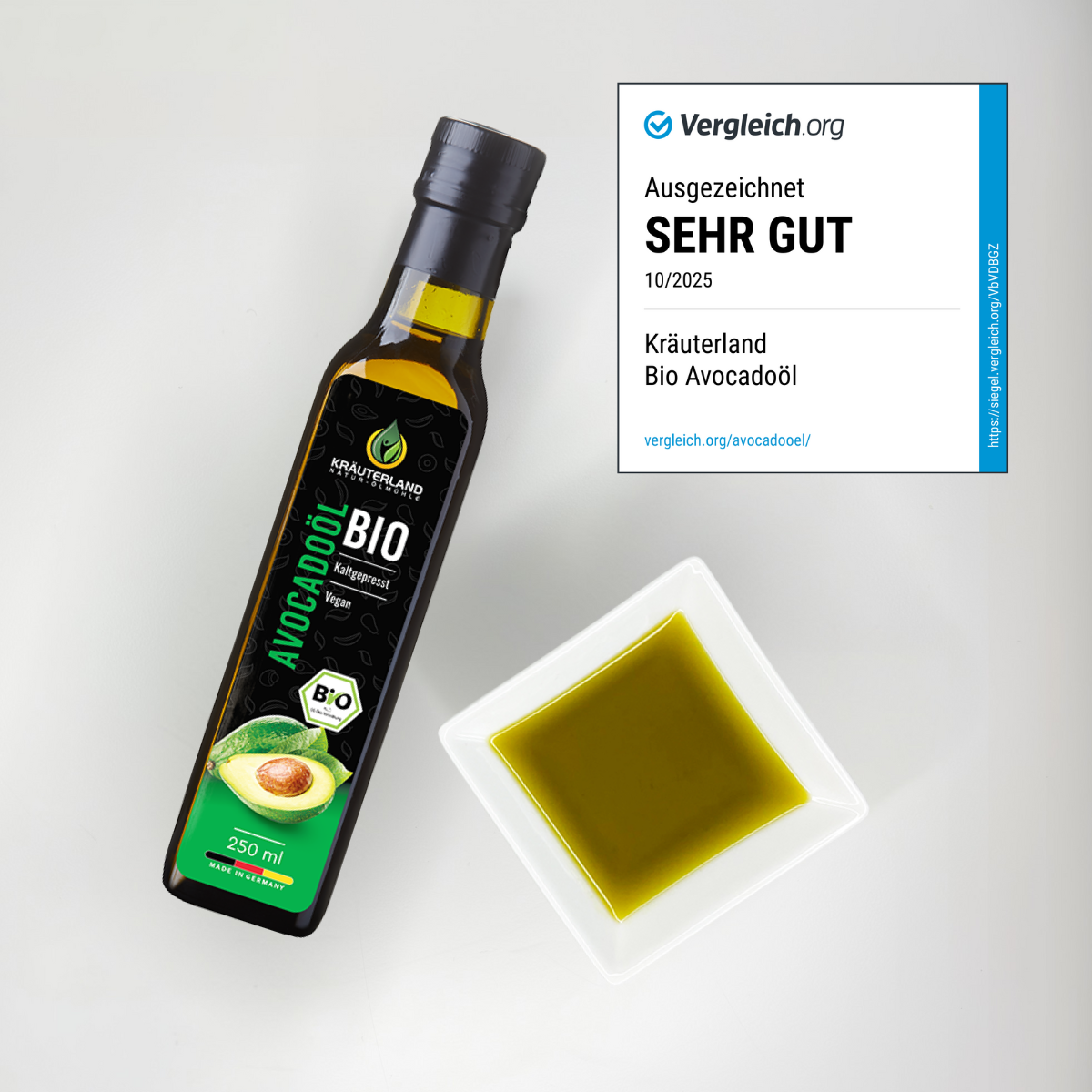 Bei dem Kräuterland Avocadoöl handelt es sich um ein 100 % natives und kaltgepresstes Avocadoöl aus biologischem Anbau. Es ist frei von Konservierungs- und Zusatzstoffen und gilt als cholesterinarm.