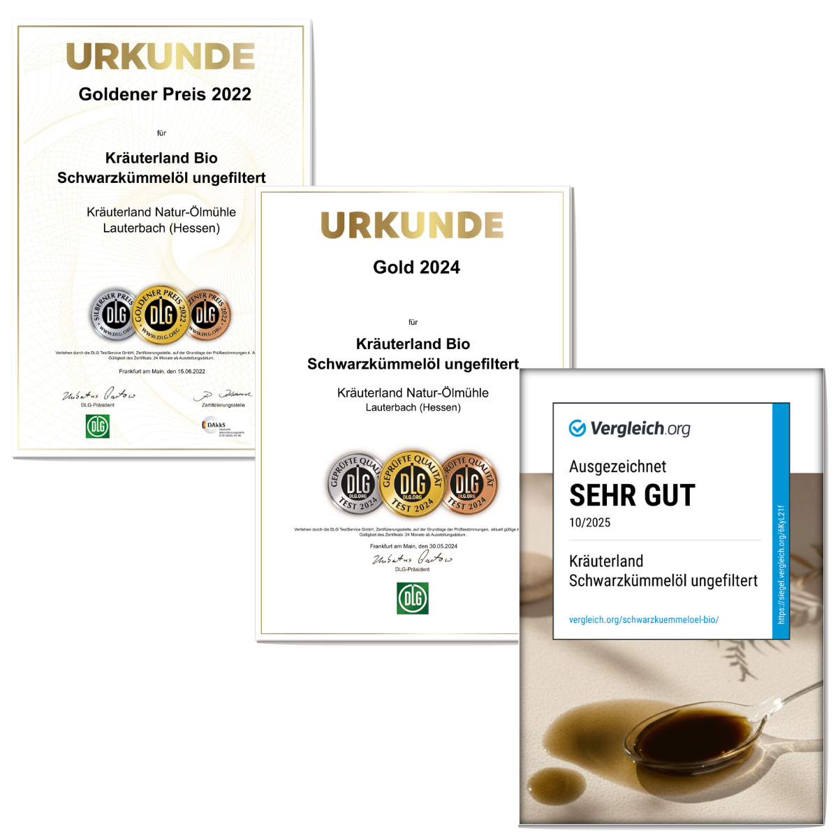 Das ungefilterte Bio Schwarzkümmelöl von Kräuterland wird täglich frisch aus kontrolliert biologisch angebauter Premiumsaat gepresst. Durch die schonende Kaltpressung bleiben die natürlichen Inhaltsstoffe, ätherischen Öle und wertvollen Fettsäuren vollständig erhalten. Unser Öl trägt die goldene DLG-Auszeichnung und steht für höchste Qualität und authentischen Geschmack.