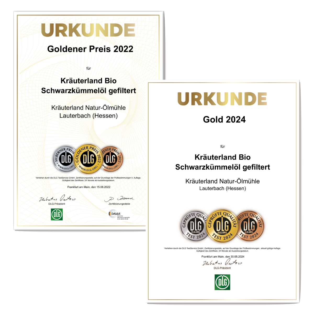 Zum dritten Mal in Folge wurde unser gefiltertes Kräuterland Bio Schwarzkümmelöl mit dem goldenen DLG-Siegel prämiert (siehe Produktbilder).