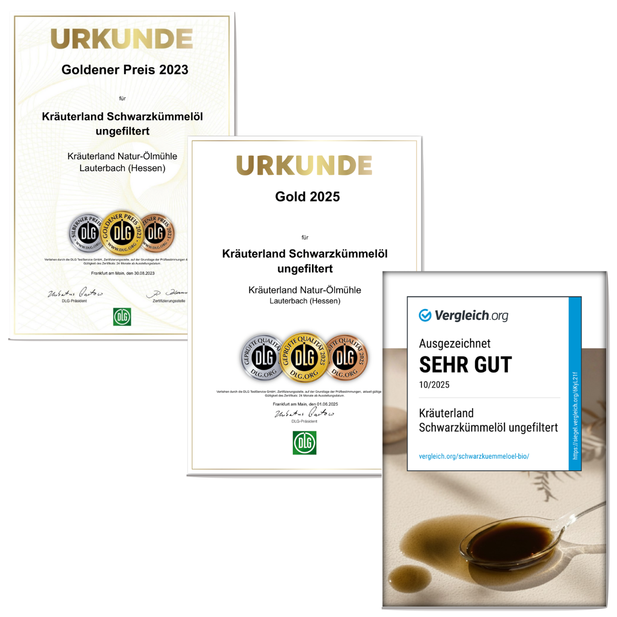 Das Ergebnis ist ein naturreines Öl mit angenehm würzigem Geschmack, das sowohl in der Ernährung als auch in der Pflege vielseitig einsetzbar ist. Bereits mehrfach wurde unser Schwarzkümmelöl mit dem goldenen DLG-Siegel ausgezeichnet – ein Zeichen für geprüfte Qualität und Reinheit.