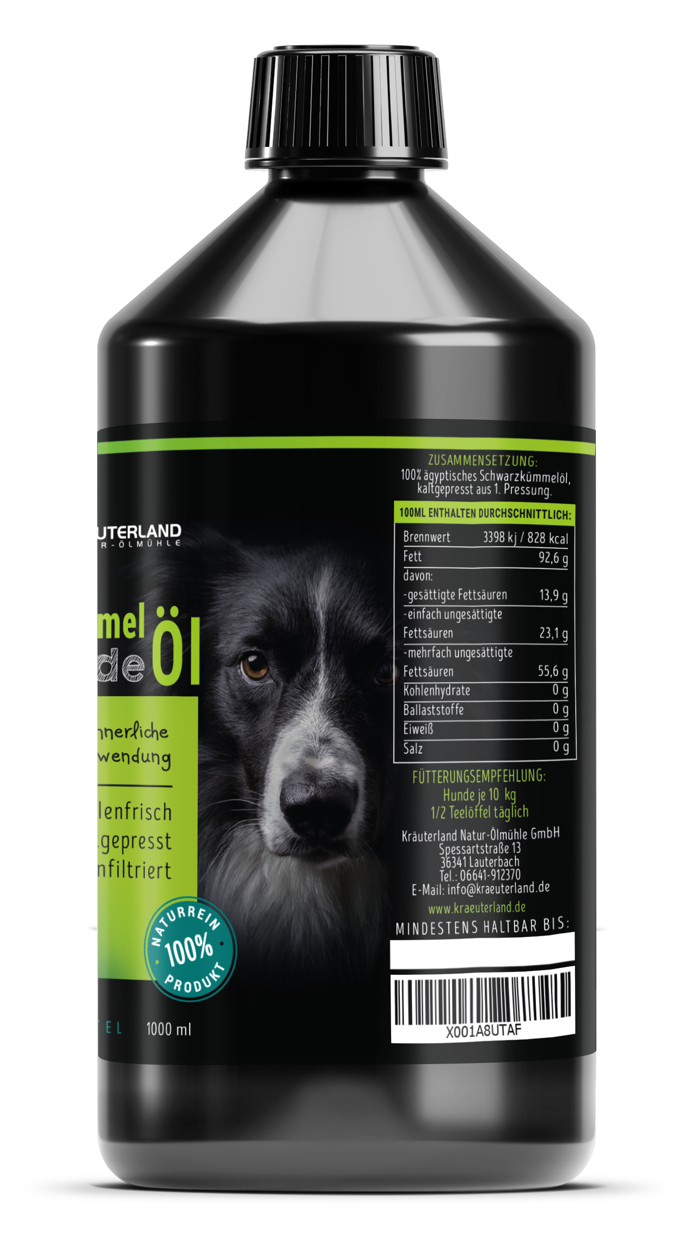 Wir liefern Ihnen das Schwarzkümmelöl in einer braunen Lichtschutzflasche, die besonders für die Dosierung von Mengen für kleine bis mittlere Hunde geeignet ist. Unser Schwarzkümmelöl kann nicht nur dem Futter beigemischt werden, sondern es kann auch äußerlich angewendet werden. Dazu geben Sie vor dem Spaziergang mit Ihrem Hund eine geringe Menge des Öls auf das Fell des Tieres.